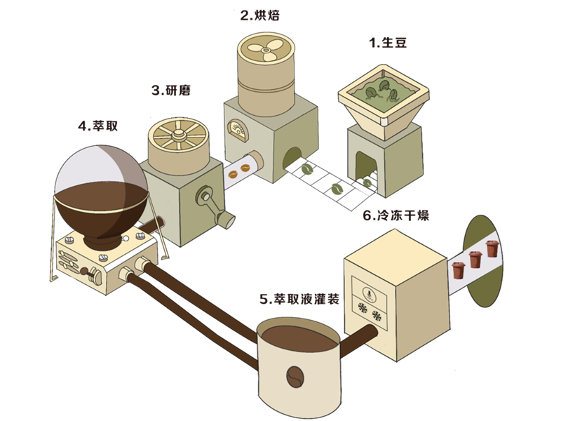 凍干咖啡工廠一般由原料車間、烘焙車間、掛耳車間、提取濃縮車間、凍干車間、包裝車間等功能車間組成。 一般配置有咖啡豆處理設(shè)備、咖啡萃取設(shè)備、濃縮設(shè)備、冷凍設(shè)備、真空冷凍干燥設(shè)備、粉碎與包裝設(shè)備、質(zhì)量檢測設(shè)備等。